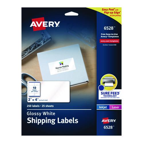 Glossy White Easy Peel Mailing Labels w/ Sure Feed Technology, Laser Printers, 2 x 4, White, 10/Sheet, 25 Sheets/Pack