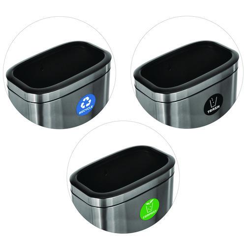 When equipping your business's interior with waste receptacles, you want to be reassured it will survive constant daily use and add to your company's aesthetic. With our modern, multi-stream waste management slim open 10.5 Gallon Stainless Steel Recycling, Trash and Compost Stations, you can be confident you are getting an everlasting product that will help maintain cleanliness in your facilities. To help accommodate a more significant amount of recycling, trash and compost, the 10.5-gallon capacity will fulfill your foot traffic demands. Included with every purchase are a durable recycling, trash, and compost sticker that will identify its intended purpose. The vibrant colors of the stickers offer optimal visibility, assuring waste goes into the proper stream. In addition, the lids of the receptacle's seamless design conceal trash bags but can be easily removed when needed. Its slim design allows it to fit comfortably in tight spaces without compromising capacity. As a result, you will gain a sufficient waste management station with ample capacity. Our slim open 10.5 Gallon Stainless Steel Recycling, Trash and Compost Stations will allow you to streamline waste collection in your high-traffic area while adding a touch of modern appeal.Package Includes: (1) Recycle Can; (1) Trash Can; (1) Compost Can; Labeling StickersNote: This is a non-returnable item.