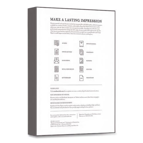 Southworth® 100% Cotton Business Paper conveys prestige with the unmistakable feel of 100% cotton fiber. The elegant texture, durability and color reproduction of cotton convey prestige for all your important documents. Perfect for presentations, reports, proposals, invoices, legal documents and more. Get personal with paper! Your choices say a lot about you and your business. The Southworth® collection of business papers is among the truly finest papers available for professional offices of any size. Communicate in style-from the first moment to enduring memory, cotton paper adds a touch of class, making first impressions more impressive with a distinct crispness and an unmistakable feel. Someone picking up your document will know, before they even read a single word, that there's something special to it. Cotton fiber also provides archival durability-it's the reason so many historic documents are still with us even centuries later.