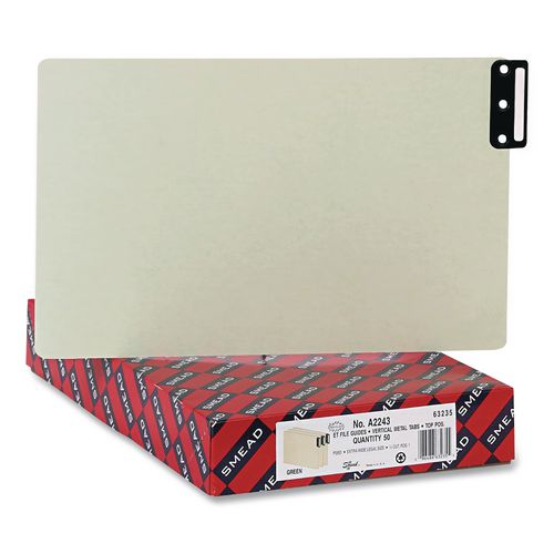 Organize or update your paperwork filing, making it easy to find the documents you need when you need them. Smead's End Tab Pressboard File Guides are designed to keep your shelf filing system tidy. Eliminate lengthy file retrieval times with our file guides that denote each category. Your filing can achieve better organization with fewer lost and damaged documents when you incorporate guides into your filing system. Metal tabs stand out among all your files and are viewable from both sides. Sturdy 25 point pressboard assures long-term durability. Improve filing efficiency so you can find exactly what you need at your fingertips. Bring order to your household and office with our filing solutions. Contain recycled content and are the perfect sustainable solution to your organizational needs.Package Includes: (50) Tab Inserts