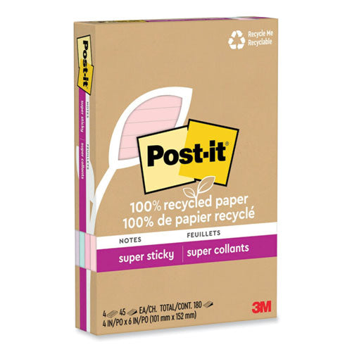Post-it 100% Recycled Paper Super Sticky Notes are made from 100% recycled paper and feature two times the sticking power to make sure your message stays put. The water-based adhesive reliably sticks to doors, windows and walls, so you can take your to-do list anywhere. Succeed in your everyday tasks and feel good knowing these notes are made in a zero-waste-to-landfill plant. Packaging is also made from 100% recycled paper.