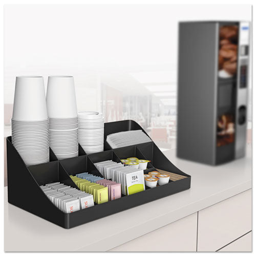 Add to the clean, modern design of your breakroom with a convenient coffee condiment organizer. The organizer's 11 compartments provide plenty of space for all of your serving essentials, including sugar, cups, stirrers, napkins, creamers and single-serve coffee pods. One-piece condiment organizer is made from a tough and safe plastic that will stand the test of time. This unit is easy to clean, so it stays attractive for a long time to come. Holds up to 300 cups. Perfect for offices with 100 employees or fewer.