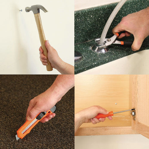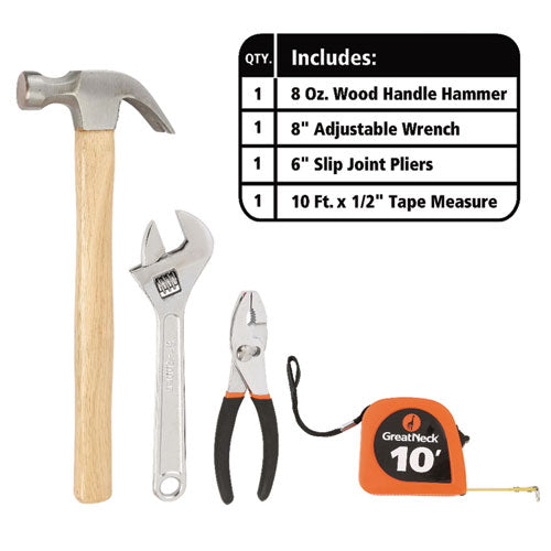 Durable 16" metal tool box contains all sorts of useful tools for minor office repairs. Includes hammer, two screwdrivers (#4 Phillips and 4" x 1/4" standard), 6" slip joint pliers, 8" adjustable wrench, 10-ft. x ˝" tape rule, retractable 9-position utility knife, safety razor scraper and 7-piece hex key set.Package Includes: (1) Carpenter's Hammer; (1) 4"-Long #4 Phillips Screwdriver; (1) 4"-Long 1/4" Flathead Screwdriver; (1) Pair of 6" Slip-Joint Pliers; (1) 8" Adjustable Wrench; (1) 10 ft Tape Measure; (1) Retractable Utility Knife; (1) Safety-Razor Scraper; (1) 7-Piece Hex Key Set; (1) Metal Box