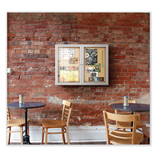 Ghent's Enclosed Cork Bulletin Board is the perfect way to display messages, pictures, and important information securely. Natural cork boards are made with self-healing cork, meaning holes made from repeated and frequent tacking will disappear. You can use staples, tacks or pins and be confident that they will stay in place without pulling from the board. Ghent's message center is hand-made to ensure the cork surface will not peel or flake from the backing when installed indoors. This enclosed bulletin board is protected using shatter-proof acrylic panels, full-length door hinges, and locks that are flush with the frame. You can install the board in high-traffic, public areas without worrying about damage or tampering. Hidden corner brackets allow the message center to sit flush against the wall without any visible hardware, which adds protection from vandalism. The cork surface is paired with a Satin aluminum frame and includes two keys. Recommended for indoor use only.Package Includes: (2) KeysNote: This is a non-returnable item.