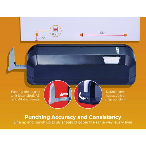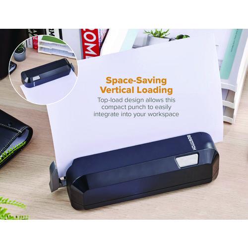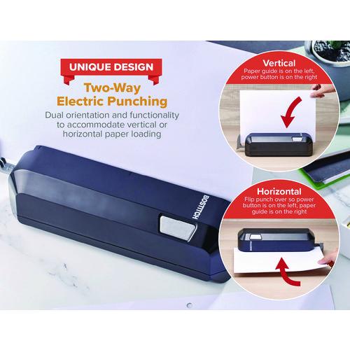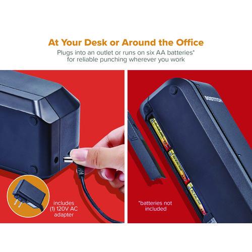 No matter who you are, when you do a lot of punching, there's no doubt it gets tiresome. Say goodbye to sore hands with the Bostitch® electric hole punch. Jam-free punching up to 20 sheets with the push of a single button, our automatic hole punch is here to bring you ease. This is the world's first dual loading electric hole punch, where you can load paper horizontally or vertically. With its non-slip base, this suits any executive, administrative or home office user, by keeping the hole punch secure and prevent slipping. Electric or portable battery operation offers you effortless punching wherever you are. Wireless battery power makes this three-hole punch ideal for portable use or hiding unsightly wires. Power the unit for wireless use with six AA batteries (sold separately). Precision steel punch heads deliver clean punching. The punch heads are a standard 9/32" width. You can accommodate various sized documents using the integrated adjustable paper guide. Use the paper guide for perfect hole placement every time, no matter the size of the paper. Each electric hole punch also features a chip drawer to keep your work area clean. To use this unit, insert your stack of papers into the unit's opening. The electric mechanism will trigger, punching a perfect set of holes in your document. It's that easy! If you're looking for a fast and effortless hole puncher, don't waste your time and energy with manual labor. With the Bostitch® electric three-hole punch, hole punching has never been easier.