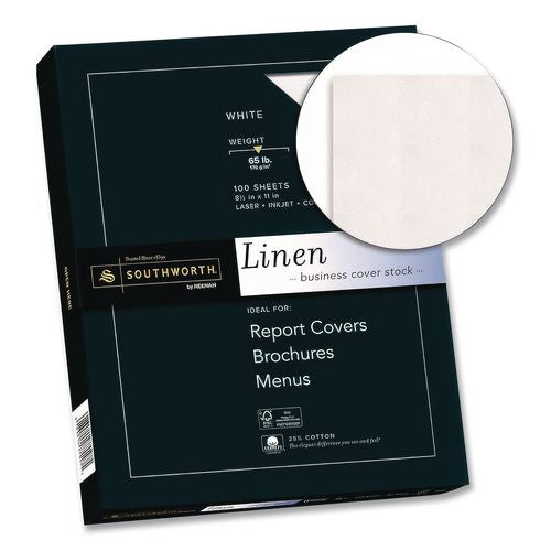 Southworth® 25% Cotton Linen Cover Stock captures the rich texture and feel of natural linen. This richly textured, cotton-fiber cover stock is ideal for report covers, brochures, menus, invitations and more-anywhere a distinctive look and feel is a must. Get personal with paper! Your choices say a lot about you and your business. The Southworth® collection of business papers is truly among the finest papers available for professional offices of any size. Communicate in style-from the first moment to enduring memory, cotton paper adds a touch of class, making first impressions more impressive with a distinct crispness and an unmistakable feel. Someone picking up your document will know, before they even read a single word, that there's something special to it. Cotton fiber also provides archival durability-it's the reason so many historic documents are still with us centuries later.