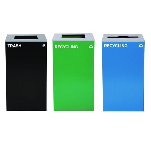 With a generous 29-gallon capacity, this bin is perfect for use in any environment - from homes to offices, schools, and more. It can handle high-volume foot traffic and require less emptying from your maintenance staff. We've crafted our bins from durable powder-coated steel to ensure they're built to last, even with heavy use. Its included removable plastic liner will prevent leaks from seeping out and is a cinch to clean when needed. In addition, we have color options allowing you to design a streamlined color-coordinated waste disposal system. As an added benefit, the equipped feet are great for lifting the receptacles off the ground, so you can easily clean around them without worrying about a ring developing. You can have a trash and recycling station as large or as small as needed and can completely customize it with the included stickers. The included lids enhance the appearance of your disposal system and keep your trash secure and protected. By providing options for proper disposal of compost, recycling, and trash, you're helping prevent it from ending up on the ground.Package Includes: (1) Blue Recycling Can with Mixed Lid; (1) Green Recycling Can with Square Lid; (1) Black Trash Can with Square Lid; (5) StickersNote: This is a non-returnable item.