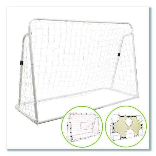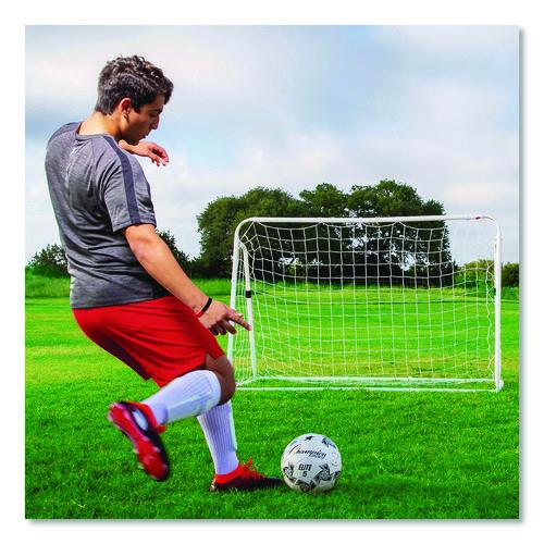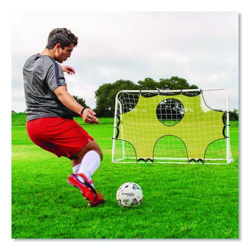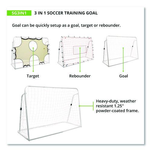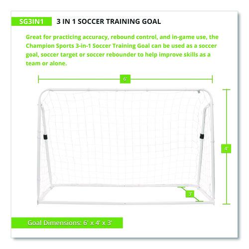 Great for practicing accuracy, rebound control, and in-game use, the Champion Sports 3-in-1 Soccer Training Goal can be used as a soccer goal, soccer target or soccer rebounder to help improve skills as a team or alone. With easy push button set up of the heavy-duty steel frame, a net, rebounder, bungee cord and target all included, drills can be started quicker on the field or in the backyard.Package Includes: Bungee Cord; Rebounder; TargetNote: This is a non-returnable item.
