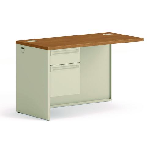 High-pressure laminate top is moisture-, scratch- and stain-resistant. Drawers operate on steel ball bearing slides. Tru-fit mitered drawers with a removable core lock. Cord management grommets and modesty panel. Not freestanding. Attach to single pedestal desk or L-workstation desk to create an L-workstation.