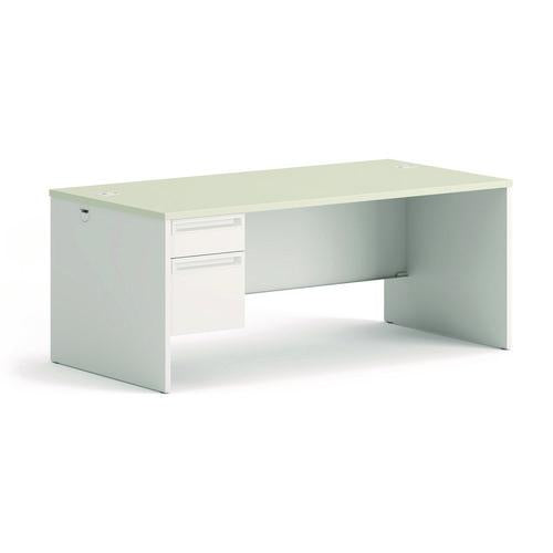 High-pressure laminate top is moisture-, scratch- and stain-resistant. Tru-fit mitered drawers operate on heavy-duty steel ball bearing suspensions. High-sided file drawer extends fully and accepts hanging files without hang rails; box drawer extends three-quarters. HON® "One Key" core removable locks. Two work surface grommets help control cord and wires. Three-quarter height modesty panel for privacy.