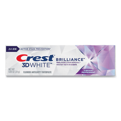 Brighten your smile and freshen your breath fresh with Crest 3D White™ Brilliance whitening toothpaste, featuring a vibrant peppermint flavor. The 3D White™ fast-whitening technology is combined with advanced stain protection. It whitens your teeth by removing up to 95% of surface stains in three days. 3D White™ fluoride toothpaste also strengthens your tooth enamel and helps to protect against cavities.Note: This is a non-returnable item.