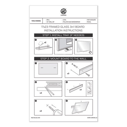 The perfect, functional solution for frequent and heavy-use environments, such as offices, homes, classrooms and commercial spaces. Contemporary design adds a touch of subtle style to your wall. Features a premium, stain- and ghost-proof, frosted-tempered-glass surface, a built-in felt bar for pinning notes and pictures, rigid construction and an ultra-durable aluminum frame. Premium ultimate glass writing surface continuously outperforms all traditional melamine, painted steel and ceramic dry erase writing surfaces. Use any dry erase board spray or wet dry erase board wipes after use to clean the writing surface. Although all dry erase and glass markers work well with this board, U Brands dry erase markers provide the ultimate writing and erasability experience.Package Includes: Mounting Hardware; Instructions