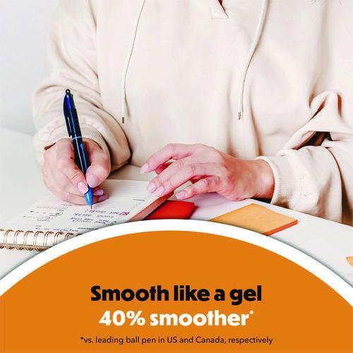 Just when you thought the legendary 4-color ballpoint pen couldn't get any better, BIC® found a way! With the 4-Color Smooth Ball Pen, you can still write in four different colors without changing pens, but now you can also enjoy writing with a ballpoint that feels like a gel. Specially formulated Smooth ballpoint ink writes 40% smoother than the average ballpoint, gliding across the page like a gel, while still lasting up to twice as long. Boasting the same iconic features as the original 4-color pen: four ink colors, color-coded ink-choice "click" buttons, attractive two-tone barrel and convenient pocket clip, the 4-Color Smooth Ball Pen is the smart choice for everyday writing tasks. Express yourself colorfully and get BIC® Smooth ink, too! Performance Guaranty (U.S. and Canada only): if not fully satisfied with the performance of this product, please return it to BIC® for a no-cost replacement.