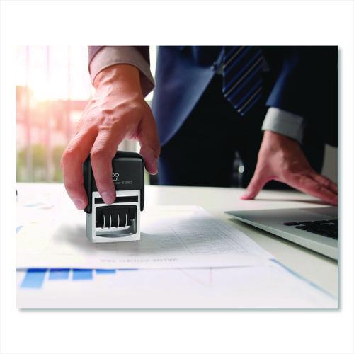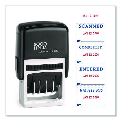 Self-inking message stamp features four interchangeable messages: Scanned, Emailed, Entered and Completed. Two-color pad for message and date. Band Shield Technology prevents ink from coming into contact with your hands and fingers during the date-changing process. Ink colors: red and blue. Five-year date band. Perfect for office use.Package Includes: Includes four interchangeable message inserts.