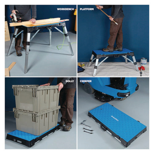 Introducing the Global Industrial 4-in-1 Portable Workbench with Power Strip. This unique product is more than just a workbench — it's a workshop all-in-one. Designed to be sturdy, portable, and powerful, it's ideal for professional contractors, mechanics, and homeowners looking to perform everything from small DIY projects to restoration and remolding. The large, non-slip work surface includes a built-in ruler, cutting groove, drill hole guide, rope connector hole, and durable steel hammer surface. Dimensions: Folding Size: 38.56"W x 19.88"D x 3.56"H; Work Table: 53"W x 32.28"D x 30.5"H; Scaffold: 46"W x 26.56"D x 18.5"H; Creeper/Dolly: 38.56"W x 19.88"D x 4.75"H.Note: This is a non-returnable item.