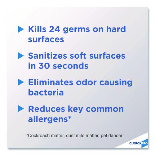 To help keep living and working environments healthy, it's important to clean and disinfect multiple surfaces, a process that once required multiple products. Clorox® 4 in One Disinfectant & Sanitizer lets you disinfect, sanitize and reduce allergens with a single all-purpose aerosol spray. This powerful cleaner disinfects hard surfaces with 24 EPA-registered kill claims, and sanitizes soft surfaces in as little as 30 seconds. It meets EPA criteria for use against SARS-CoV-2, the virus that causes COVID-19, on hard nonporous surfaces when used as directed. This disinfecting spray even kills odor-causing bacteria in the air, and leaves behind a refreshing scent. On top of that, Clorox® 4 in One reduces pet dander, dust mite matter and cockroach matter allergens which can trigger allergies and asthma. Ideal for offices, day care centers, schools, hotels, restaurants and other commercial facilities. No precleaning required. CloroxPro®, where clean means everything.Package Includes: Includes 12, 14oz bottles per carton