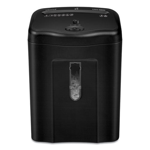Shreds up to 11 sheets at a time into small cross-cut particles (Security Level P-4). Safety switch disables shredder for added protection. Quiet shredding for home and small offices. Also safely shreds staples, paper clips and plastic credit cards. Runs continuously for up to five minutes before a 30 minute cool down period is needed. Five-gallon waste bin with easy lift-off head.