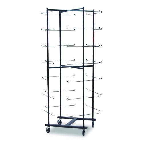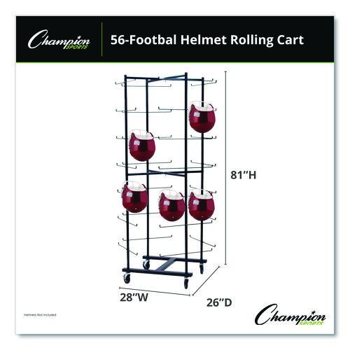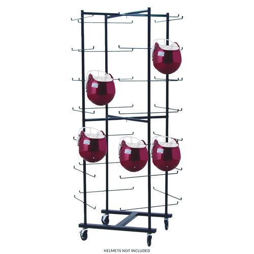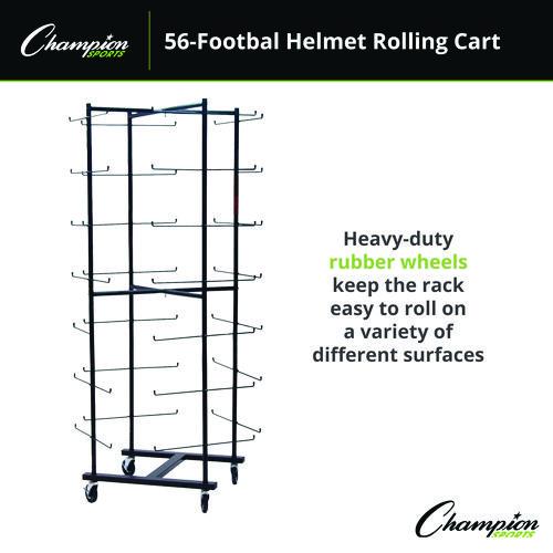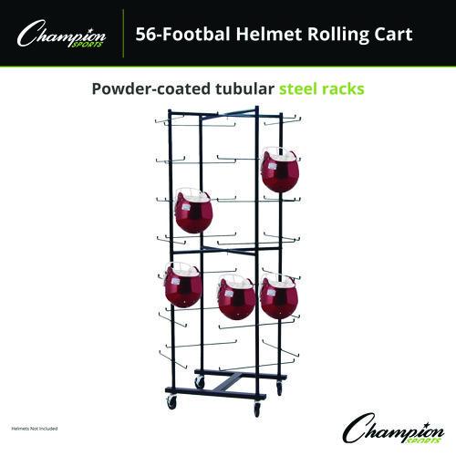 Perfect for keeping a high school or club equipment room neatly organized, this Champion Sports Rolling Football Helmet Rack easily stores up to 56 helmets. The football helmet rack is made from tough tubular steel, with an attractive and durable powder coated finish. Heavy-duty rubber wheels make it easy to roll from the gym to the storage room, or even out onto the field outside. Helmets are hung through the ear openings onto rigid steel rods, which feature safety curves at the ends.Note: This is a non-returnable item.