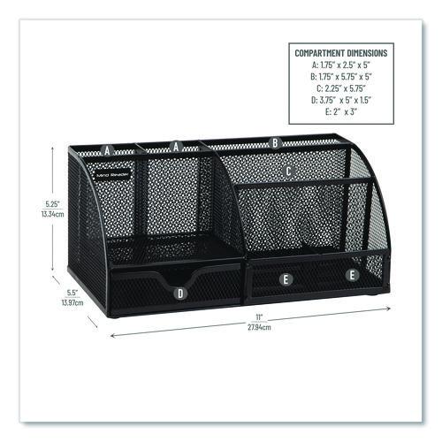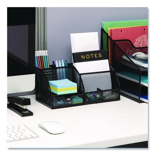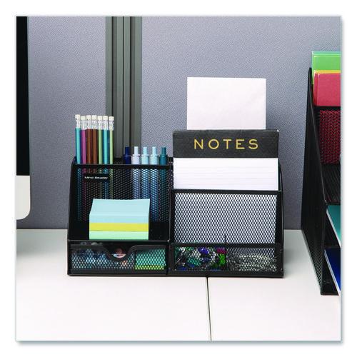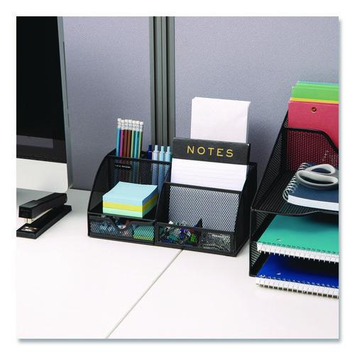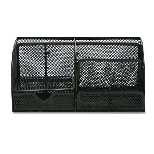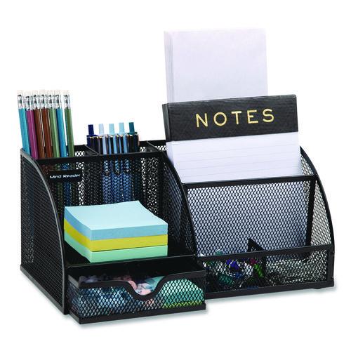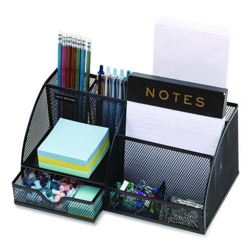Get organized and boost productivity with this sleek and functional desktop organizer. The black metal mesh design adds a touch of style to your workspace while keeping all your supplies and accessories in order. With a minimalist design and seven compartments, this organizer is perfect for reducing desktop clutter, so you can spend more time working. Save space on your desk with this compact organizer that fits on nearly any desk without taking up too much valuable room. Designed to keep your important supplies within easy reach, so time is not wasted locating these items. This durable desktop organizer is built to last, made from sturdy metal that is built to withstand the wear and tear of everyday use.