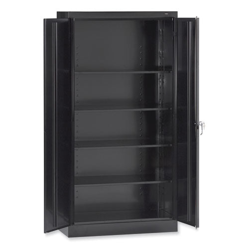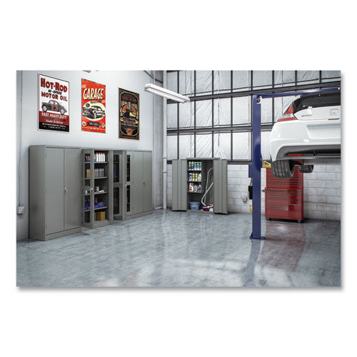 Commercial grade steel storage cabinet. Built with premium quality steel and reinforced doors for long-term performance at an attractive price. Polished chrome handle uses three-point keyed locking to lock both doors. Storage cabinet is electrostatically painted with a tough, long lasting powder finish to ensure years of lasting beauty.