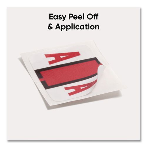 Keep files organized at a glance with these alphabetic labels that feature a wraparound solid color bar and a colored character printed on a white background. Colors are compatible with end tab systems using the bar-style format. Convenient dispensing box for easy peel off and application. Includes 500 labels per roll. Compatible with Tab® Products 1283 series alphabetical labels.