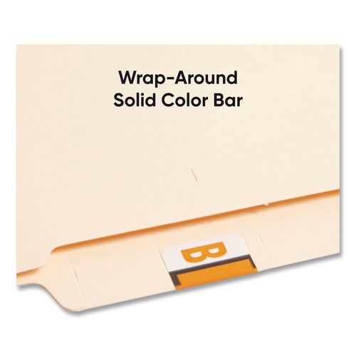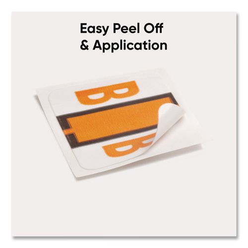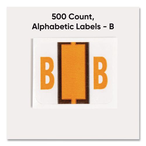 Keep files organized at a glance with these alphabetic labels that feature a wraparound solid color bar and a colored character printed on a white background. Colors are compatible with end tab systems using the bar-style format. Convenient dispensing box for easy peel off and application. Includes 500 labels per roll. Compatible with Tab® Products 1283 series alphabetical labels.