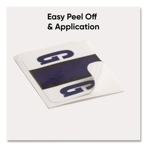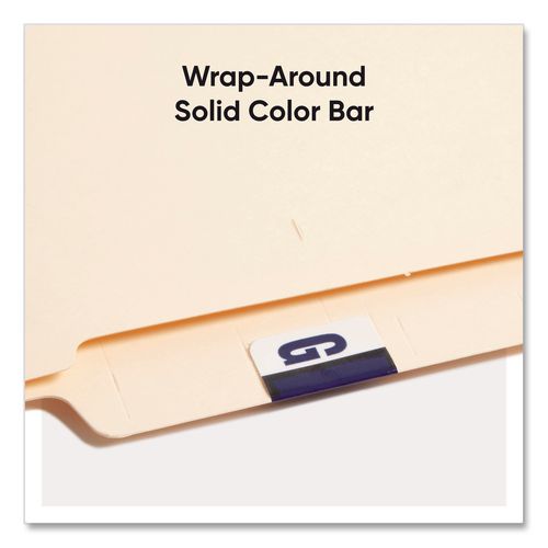 Keep files organized at a glance with these alphabetic labels that feature a wraparound solid color bar and a colored character printed on a white background. Colors are compatible with end tab systems using the bar-style format. Convenient dispensing box for easy peel off and application. Includes 500 labels per roll. Compatible with Tab® Products 1283 series alphabetical labels.
