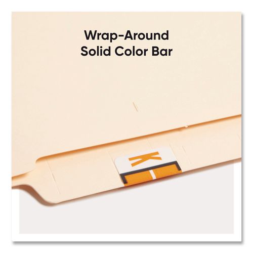 Keep files organized at a glance with these alphabetic labels that feature a wraparound solid color bar and a colored character printed on a white background. Colors are compatible with end tab systems using the bar-style format. Convenient dispensing box for easy peel off and application. Includes 500 labels per roll. Compatible with Tab® Products 1283 series alphabetical labels.