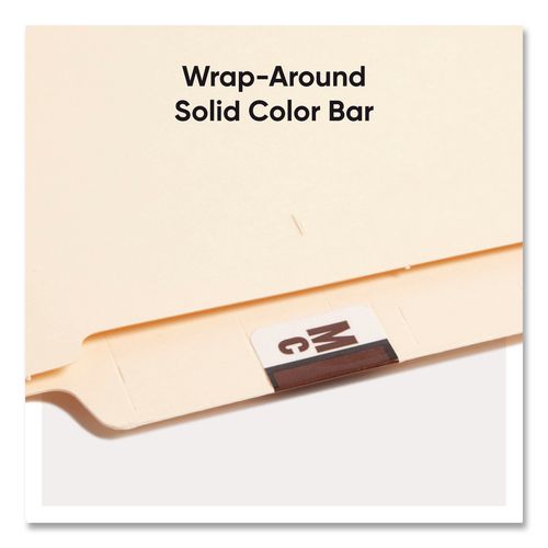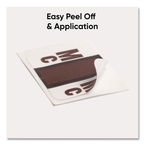 Keep files organized at a glance with these alphabetic labels that feature a wraparound solid color bar and a colored character printed on a white background. Colors are compatible with end tab systems using the bar-style format. Convenient dispensing box for easy peel off and application. Includes 500 labels per roll. Compatible with Tab® Products 1283 series alphabetical labels.