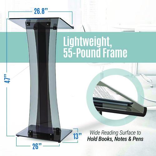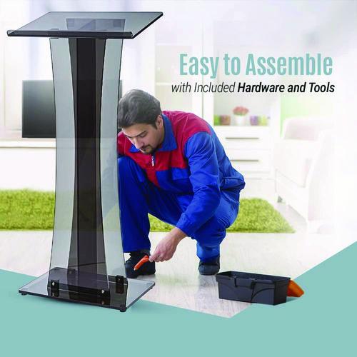 Add panache and pizzazz to your presentations with this speaker's stand. Speakers can make their positions clear from a position of power while keeping things organized and running smoothly. This stylish podium is ruggedly designed using acrylic plexiglass material to furnish long-lasting strength and use for years to come. Even though acrylic is lightweight, it boasts great strength and is shatter-resistant. It won't break even if it hits the ground, and effortlessly shrugs off point-making pounding when you become passionate about your topic! Its sleek, swept-back modern design will seamlessly enhance any interior space, plus it suggests that presenters are keeping up with the times regardless of what they are presenting. You can refresh yourself or your memory utilizing the handy, built-in beverage and note shelf. Boasting a 47" height and a generous, presentation surface, this sleek podium will deliver a professional look anywhere it's used. The generous, lip-equipped surface prevents papers and books from sliding, keeping your notes in place when reading so your presentation goes off without a hitch. Meanwhile, the large base provides stability and is outfitted with four rubber feet to protect floors from scratches and unsightly scuff marks. This attractive, durable podium is ideal for use in meeting halls and religious establishments to make a speech, in the classroom to give lectures, or in restaurants to keep reservations and waiting lists handy. It includes eight screws and assembly tools so you can easily affix the base and reading surface, allowing you to stand up and let your ideas be heard in no time at all.Package Includes: (8) ScrewsNote: This is a non-returnable item.