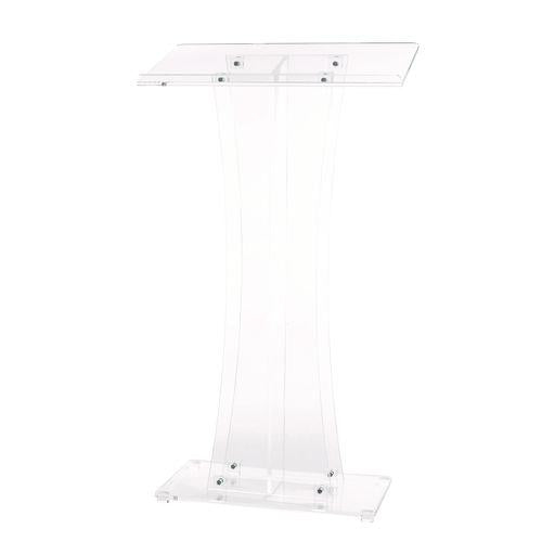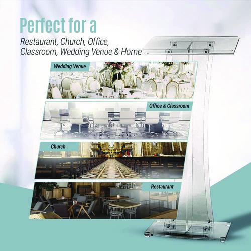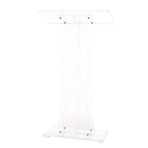 Add panache and pizzazz to your presentations with this speaker's stand. Speakers can make their positions clear from a position of power while keeping things organized and running smoothly. This stylish podium is ruggedly designed using acrylic plexiglass material to furnish long-lasting strength and use for years to come. Even though acrylic is lightweight, it boasts great strength and is shatter-resistant. It won't break even if it hits the ground, and effortlessly shrugs off point-making pounding when you become passionate about your topic! Its sleek, swept-back modern design will seamlessly enhance any interior space, plus it suggests that presenters are keeping up with the times regardless of what they are presenting. You can refresh yourself or your memory utilizing the handy, built-in beverage and note shelf. Boasting a 47" height and a generous, presentation surface, this sleek podium will deliver a professional look anywhere it's used. The generous, lip-equipped surface prevents papers and books from sliding, keeping your notes in place when reading so your presentation goes off without a hitch. Meanwhile, the large base provides stability and is outfitted with four rubber feet to protect floors from scratches and unsightly scuff marks. This attractive, durable podium is ideal for use in meeting halls and religious establishments to make a speech, in the classroom to give lectures, or in restaurants to keep reservations and waiting lists handy. It includes eight screws and assembly tools so you can easily affix the base and reading surface, allowing you to stand up and let your ideas be heard in no time at all.Note: This is a non-returnable item.