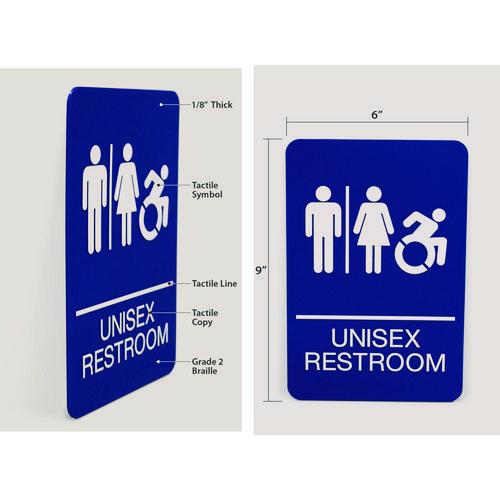 Universally and easily recognizable white graphics. Raised tactile graphics with Grade 2 Braille. Meets Americans with Disabilities Act (ADA) requirements. Includes double-side adhesive tape for mounting to door or wall.Package Includes: Mounting Tape