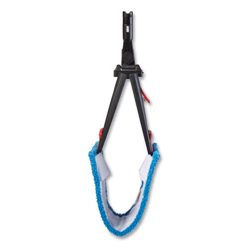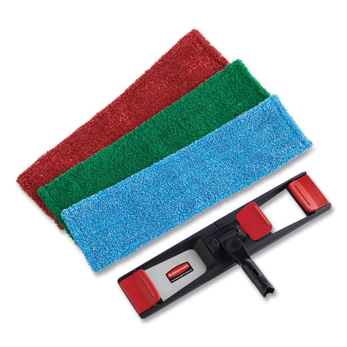 The Adaptable Flat Mop Pad connects to the Adaptable Flat Mop Frame via tabs or pockets for two styles of microfiber mopping in large spaces. Strong black tabs connect to frame via red clips to hold mop pad on during rinsing and wringing. Pocket function allows for simple microfiber mopping with your spray mop handle. Made of high-quality polyester/nylon split microfiber, the pad can be laundered up to 200 times (100 with bleach). Compatible with Quat, chlorine bleach, and hydrogen peroxide. Microfiber pad removes 99.7% or more of tested viruses (Feline Calicivirus a surrogate for Norovirus) and bacteria (MRSA, Pseudo, C.diff) with water only to help improve cleaning efficacy. Floors dry 4X faster when mopping with microfiber pads, compared to Rubbermaid large cotton string mops.