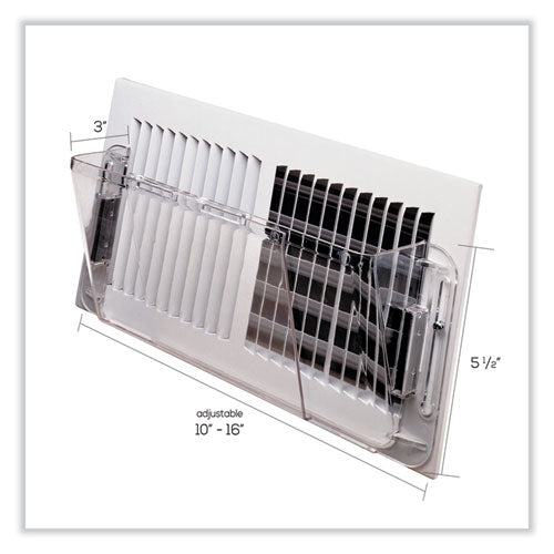 Direct central forced air and save money on heating and cooling costs with a deflecto® Adjustable Sidewall Register Air Deflector. It adjusts to fit metal floor registers from 10" to 16" wiide. Suitable for both central air heating and cooling applications, this air deflector helps direct forced air in the direction you want for added comfort around the home or office. Clear, durable plastic design features built-in magnets and molded screw holes to help secure the air deflector to the sidewall register.