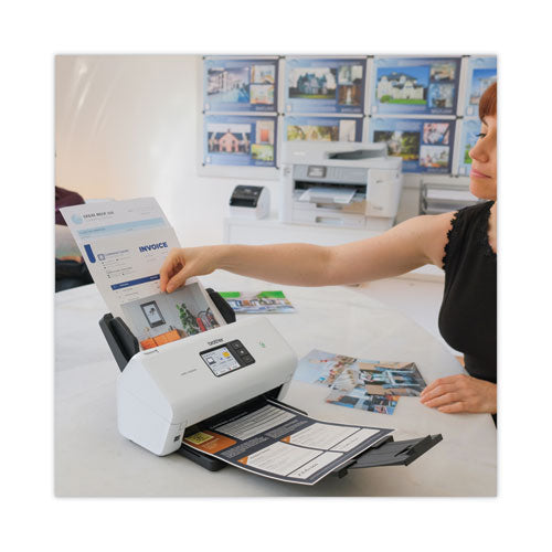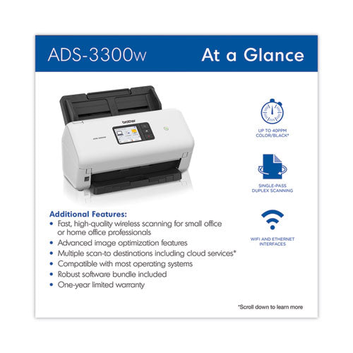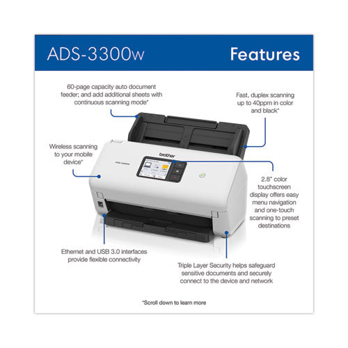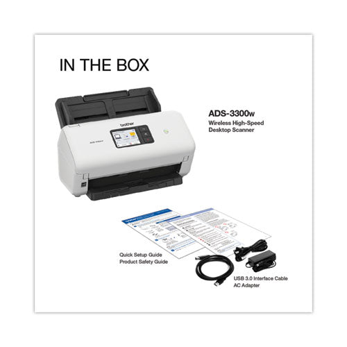 Say goodbye to big machines and hello to organized, productive workspaces with the Brother ADS-3300W High-Speed Desktop Scanner. Stacked with helpful features, this scanner boasts a 2.8-inch color touchscreen and advanced security. A powerful addition to any small workspace, it's ideal for mid to volume scanning. With single and double-sided speeds of up to 40 ppm, this timesaver has an impressive capacity of up to 60 pages. With multiple scan-to destinations including mobile and email servers, along with wireless and wired Ethernet network connectivity, it includes a robust software bundle valued at over $250. This is the document management solution for small and home businesses.Package Includes: AC Adapter; Setup Guide; USB 3.0 Cable