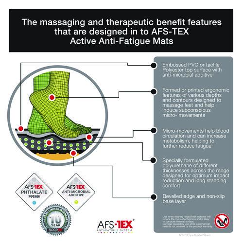 AFS-TEX Active Anti-Fatigue mats are designed to provide the ultimate standing surfaces combining prolonged comfort and effective body support. Reduces the strain on feet, legs, knees and back joints that can be caused through prolonged standing. The AFS-TEX 2000X incorporates ergonomic surface features that encourage regular movement which stimulates blood flow, increase the body's metabolism and helps with further fatigue relief. Contains antimicrobial content to protect the mat surface from microbial deterioration. Effective 24/7 for the life of the product. Anti-slip base for stability. Non-toxic and phthalate free. Ideal for office or home use.