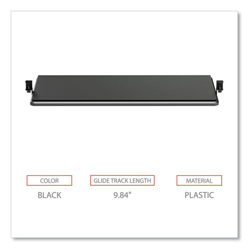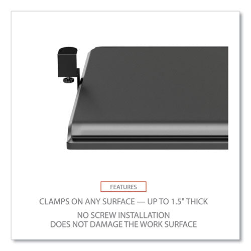 Smooth movement slide-out tray puts your keyboard right where you need it, under your desk for improved ergonomics. Easy to install with sturdy metal clamps on any surface up to 1.5" thick. No screw installation does not damage the work surface. Impact resistant, plastic tray fits most standard and ergonomic keyboards. A great choice when under-desk crossbars, hardware, or other obstructions make permanent mount keyboard trays impossible to install.