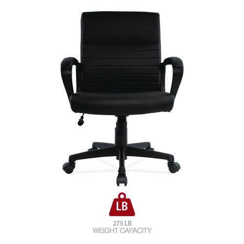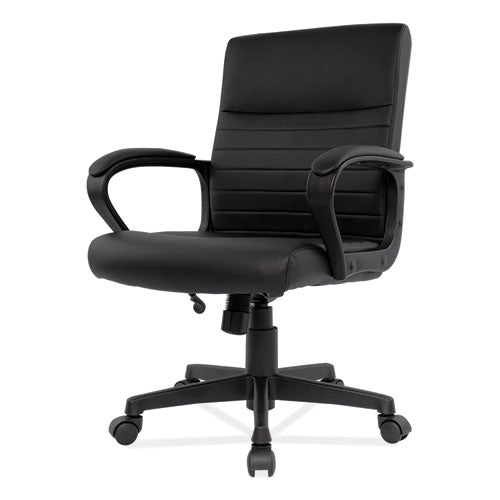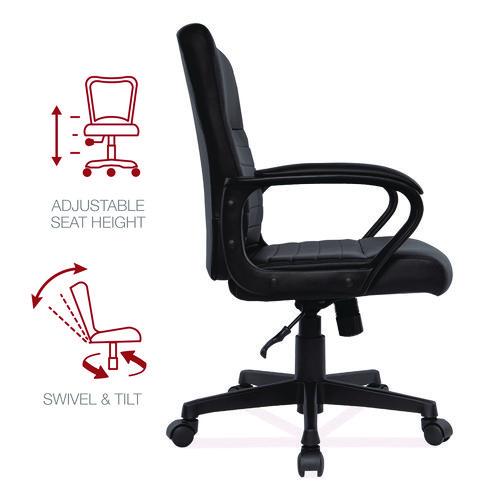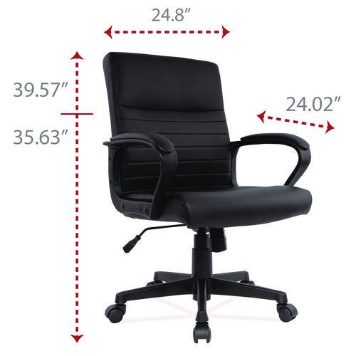 Enjoy all-day comfort while working in the sleek and contemporary manager's chair. The padded armrests and lumbar support provide added comfort. The soft, black upholstery looks and feels just like real leather and is designed for durability and easy clean-up. The pneumatic seat height adjustment and tilt tension allow you to easily find and lock the perfect position. The self-adjusting headrest supports your neck, helping to reduce strain.