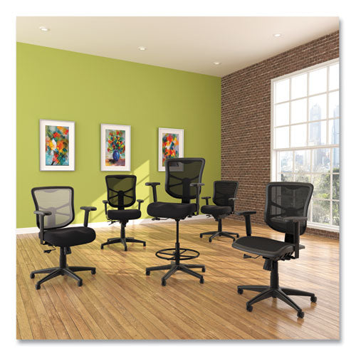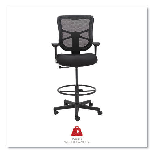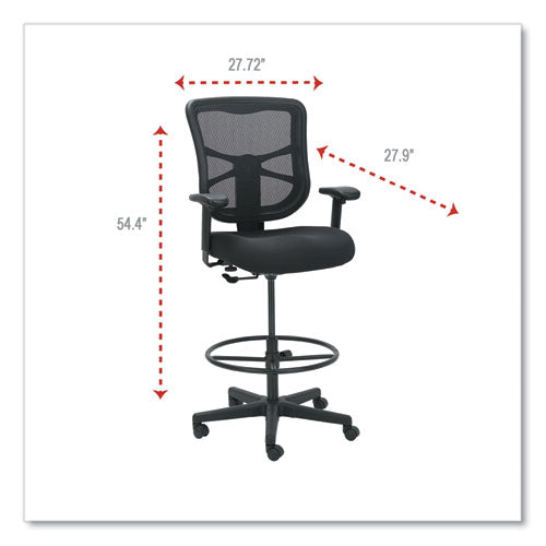 Ergonomically designed stool adjusts to fit multiple users. Cool, breathable mesh back. Contoured seat cushion with waterfall edge to help relieve pressure on knees. Adjustable foot ring for leg support. Weighted steel reinforced five-star base with casters and also compatible with glides, which are sold separately. Height adjustable ratchet back for optimal lumbar support. Height- and width-adjustable arms with soft pads.