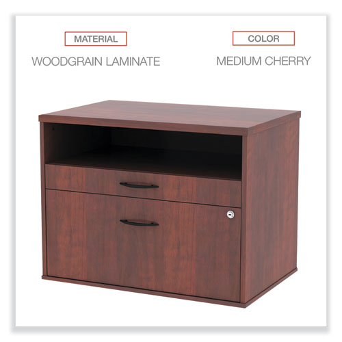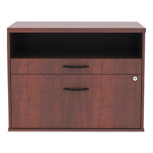 Sturdy file cabinet holds letter or legal files and is great for storage or as a low credenza with your desk. Can be used as a return to expand your desk space to create "L" or "U" shaped desk configurations. Coordinating laminates for use with Alera® Valencia, Sedina, or Open Office Desk Series. Three storage spaces including lateral file drawer, pencil drawer, and open storage. Full extension, ball-bearing slides for easy access to everything. Configurable left or right-handed. Durable woodgrain laminate is scratch, dent, and water-resistant. Leveling glides compensate for uneven floors. Two, fold-away safety keys.