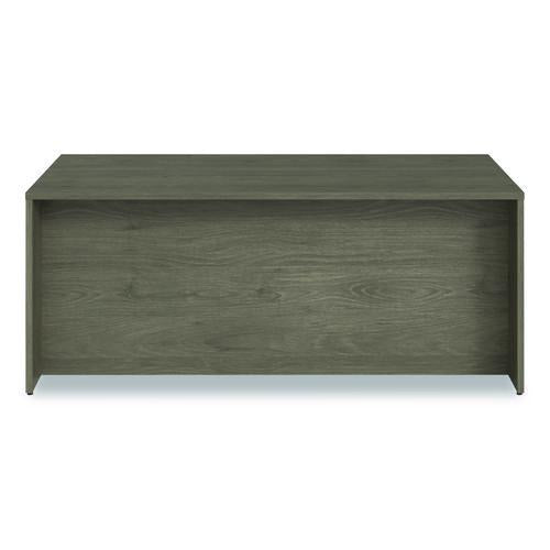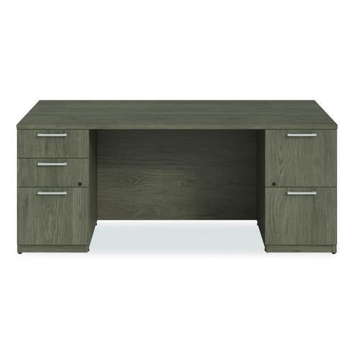 A thoughtfully designed piece that offers both functionality and style for any office environment. Equipped with two pedestals, this desk maximizes storage space to keep your workspace organized and clutter-free. These drawers offer versatile storage solutions for your office supplies, files, and personal items, allowing you to access what you need with ease. The double-pedestal design offers sturdy support, while the laser edge band construction enhances durability for long-lasting use. Crafted from particleboard, the desk is finished with a rich laminate and thermofused melamine (TFM), combining both strength and aesthetics. The premium laminate is resistant to burns and impacts, making this desk ideal for a high-traffic office setting. Its surface is designed to withstand the daily wear and tear of a busy work environment, ensuring that it maintains its sleek appearance over time. To enhance functionality, the desk includes two grommets for convenient cable management, allowing you to keep wires and cords organized and out of the way. Additionally, adjustable glides provide stability on uneven flooring, ensuring a level surface no matter where the desk is placed.