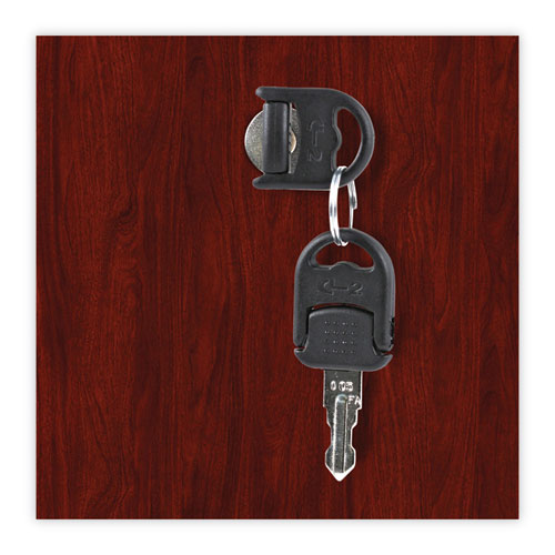 Pedestal file cabinet attaches under worksurface, making it ideal for accessing files from your desk. Sturdy, four-sided drawer construction with separate front panel. Full-extension ball bearing slides on file drawer for easy access to files. Drawers lock for securing contents. Durable 3 mm edge banding protects against bumps and dings. Two, fold-away safety keys for a slimmer profile are included.