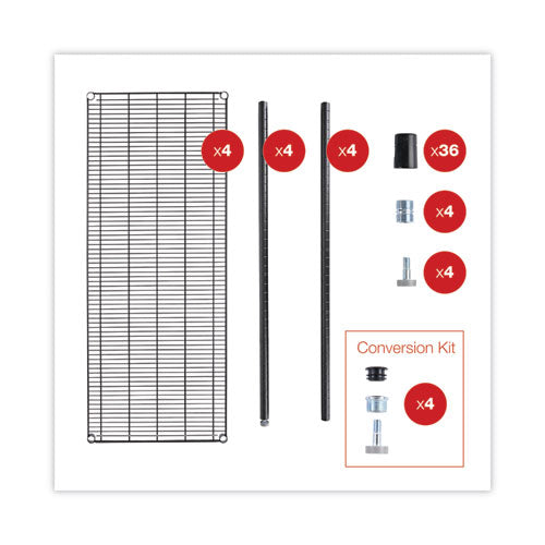 Universal storage solution that's ideal for industrial, foodservice, medical, and all other storage needs. Long-lasting, industrial grade finish resists corrosion in even the harshest environment, wet or dry. Heavy-duty shelves withstand constant re-stocking. Can be used in freezer applications and with an open design that allows for air circulation. Snap-together design assembles in minutes without tools. Can be set up as a four-tier, single rack or as two, two-tier racks to meet specific needs. NSF certified for wet and dry usage.Package Includes: (4) Shelves; Posts; Feet Leveling Glides; Conversion Kit to Convert to Two Half-Height (36"H) Two-Shelf Units