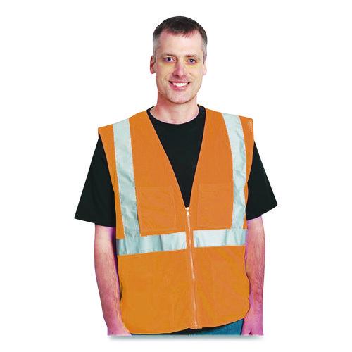 Stay comfortable while maintaining your safety. Safety vest is made from 100% breathable polyester mesh which keeps you cool. Hi-visibility with 2" silver reflective tape. Features one internal lower pocket and one external chest pocket which provides easy-to-access storage. Zipper closure. Ideal for roadway construction workers, survey crews, utility workers, railway and metro workers and emergency response personnel.