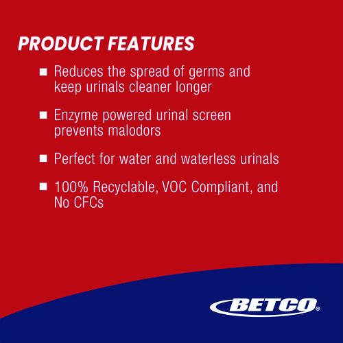 Create cleaner and healthier restrooms with Betco's Anti-Splash Urinal Screens. Reduce the spread of germs and odors in urinals while leaving behind a long lasting fragrance. Patented Micro-Tubed Technology allows the heat activated plastic pores to open with concentrated fragrance when in contact with urine.Note: This is a non-returnable item.