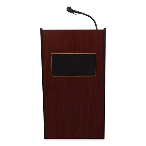 The Model #6010 Aristocrat is an illustrious, executive-style sound lectern of fine and spacious cabinetry adorned with gold-colored trimming. Its 50 W amplifier with two built-in 8 speakers is just right for venues like large conference rooms and auditoriums that hold an audience of around 2,500. Multimedia capabilities include simultaneous usage with two wired and one wireless (optional) microphones. This sound lectern comes complete with a handheld mic with 9 ft cable and a tie-clip/lapel mic with 10 ft cable. It operates either by AC plug or with optional battery model PS12-V and features input jacks for CD players, extension speakers, recording outputs and playing MP3s. Includes a surface-mounted digital timepiece for monitoring speech duration and four concealed easy-roll casters (two locking) for smooth mobility.Note: This is a non-returnable item.