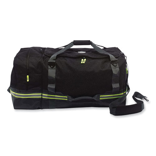 The Arsenal 5008 Firefighter Turnout Bag is designed to organize and haul bulky firefighter gear, work gear, tower climber safety equipment and more. Built tough to withstand harsh conditions, the exterior is made with durable 1,000D polyester and a reinforced water-resistant tarpaulin-reinforced bottom to keep gear dry and protected. The main clamshell compartment is large enough to store firefighter gear and boots, while the zippered side pouch can hold a firefighter helmet, safety hard hat or SCBA mask. A padded shoulder strap and top handle makes it comfortable to transport heavy gear, while multiple handles around the sides allow for quick loading and unloading no matter which way the bag is faced. Reflective accents enhance visibility in low-light conditions. The heavy-duty work duffel bag is ideal for protecting and transporting daily use gear, particularly for volunteer firefighters, EMS medical personnel, tower safety climbers and more.Note: This is a non-returnable item.