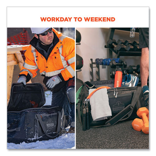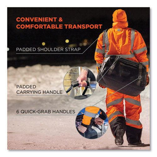 The Arsenal 5031 Water-Resistant Duffel Bag is built tough to withstand harsh conditions, with heavy-duty cold- and water-resistant tarpaulin and 600D coated polyester to keep gear dry and protected in any season. Durable zippers on the top clamshell opening are also covered by an overhang to prevent water from leaking inside. A padded shoulder strap and top handle makes it comfortable to transport heavy gear, while six handles around the sides allow for quick loading and unloading no matter which way the bag is faced. A thick reinforced base provides added protection and support to hold the bag's shape even when empty. The large clamshell compartment opens wide for convenient access when packing or unpacking, while the squared shape of the bag helps maximize storage space. For accessory storage and organization, the main compartment features a mesh zippered top pocket, a large zippered side pocket and three elastic side pockets.Note: This is a non-returnable item.