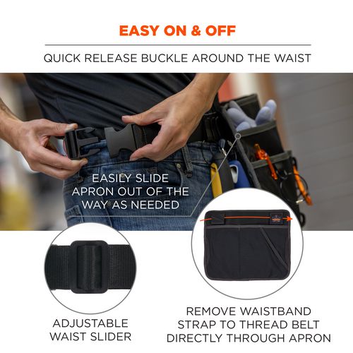 The Arsenal 5715 Cleaning Apron is a convenient and wearable cleaning pouch designed to keep supplies organized and easily accessible on the job. Constructed with a durable, water-resistant exterior, this cleaning apron is built to last and features a padded backside with mesh material for increased airflow and all-day, comfortable use. Built specifically for cleaners, this apron features seven deep pockets on the front to store cleaning supplies, such as dusters, brushes, spray bottles and more. The backside features three mesh pockets to store towels, rags and trash bags. An adjustable waistband belt is included with a quick-release buckle to fit various waist sizes. If preferred, the waistband belt can be removed and the pouch can thread directly through the wearer's belt. The pouch easily swivels to the front, side or back to clear out of the way when not in use. This cleaning apron includes two mesh wash bags, three wire cable key rings and three belt clips. Wire cable key rings attach to tools with a captive eye and hang on waistband belt for quick access. Belt clips attach to waistband belt and accept wire cable key rings. Nametag label for personalization. Machine washable.Note: This is a non-returnable item.