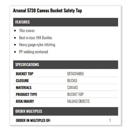 This canvas bucket with safety top features an easy on, easy off bucket cover for safely and securely hoisting equipment on the jobsite.Note: This is a non-returnable item.